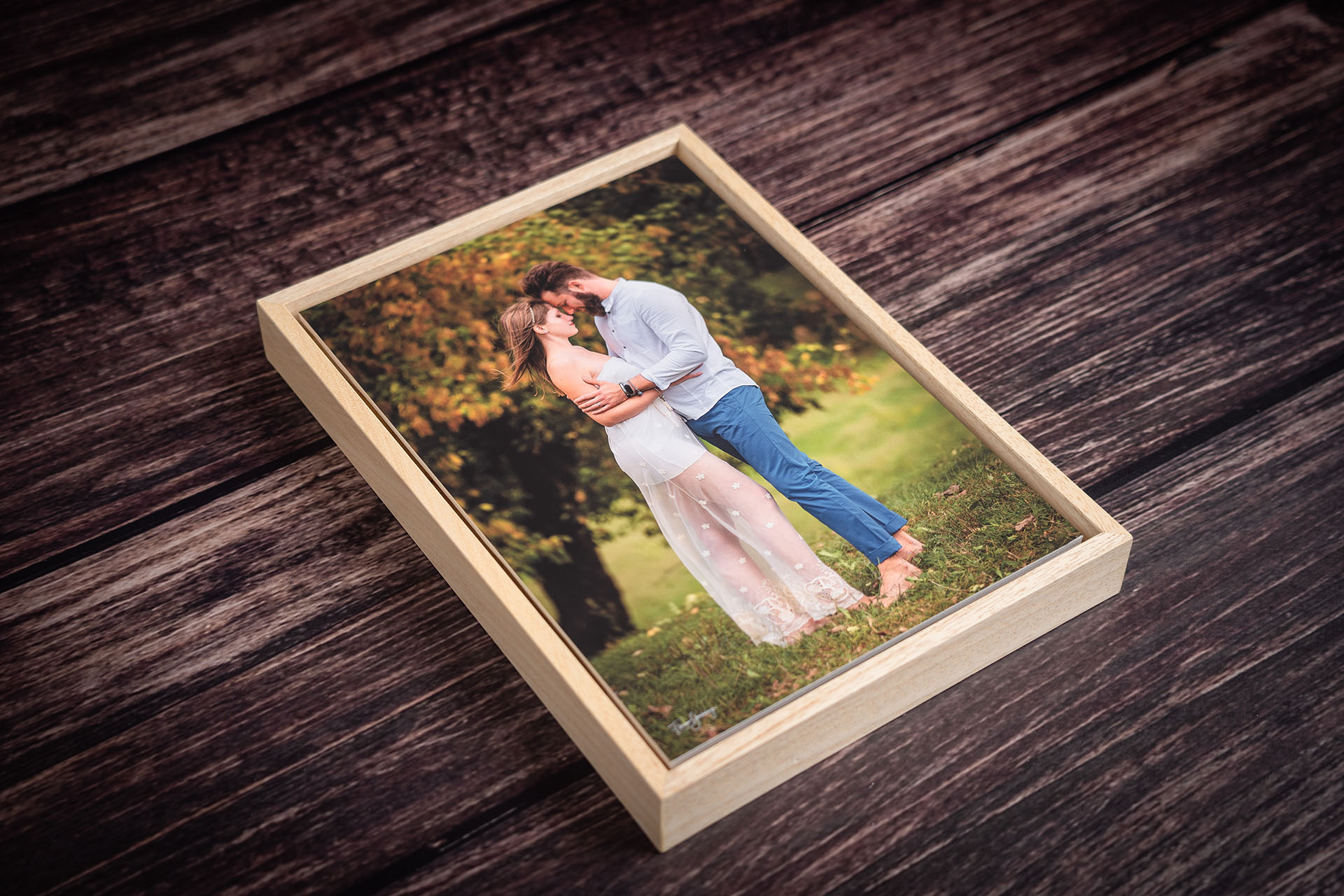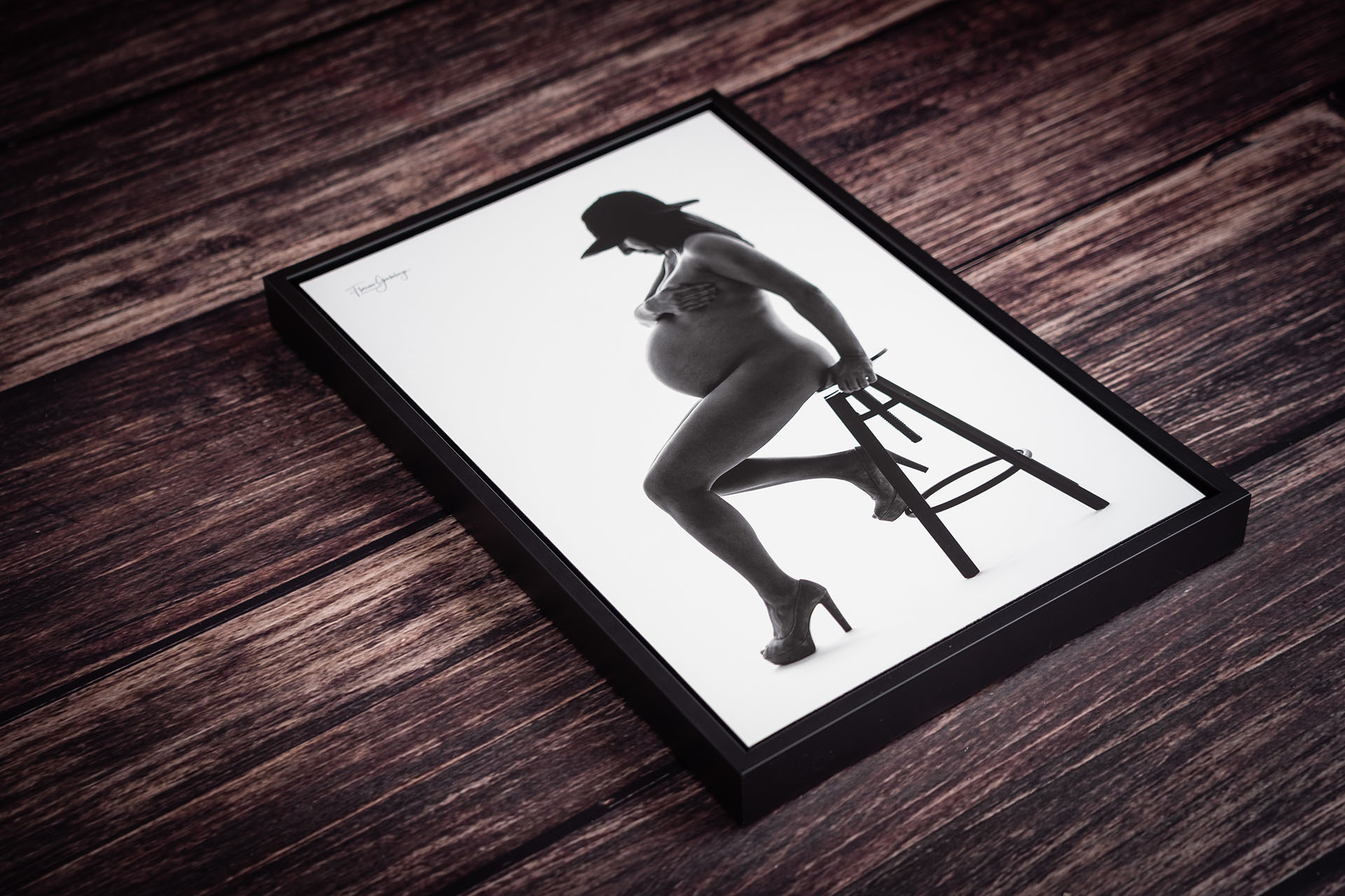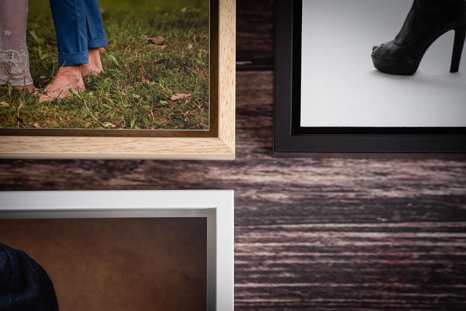 Cornice in legno stile Moderno. Finitura laccata opaca, colore bianco, nero e legno grezzo. La stampa FineArt è applicata ad un pannello da 5 mm e posizionata al centro della cornice senza però entrarne in contatto.