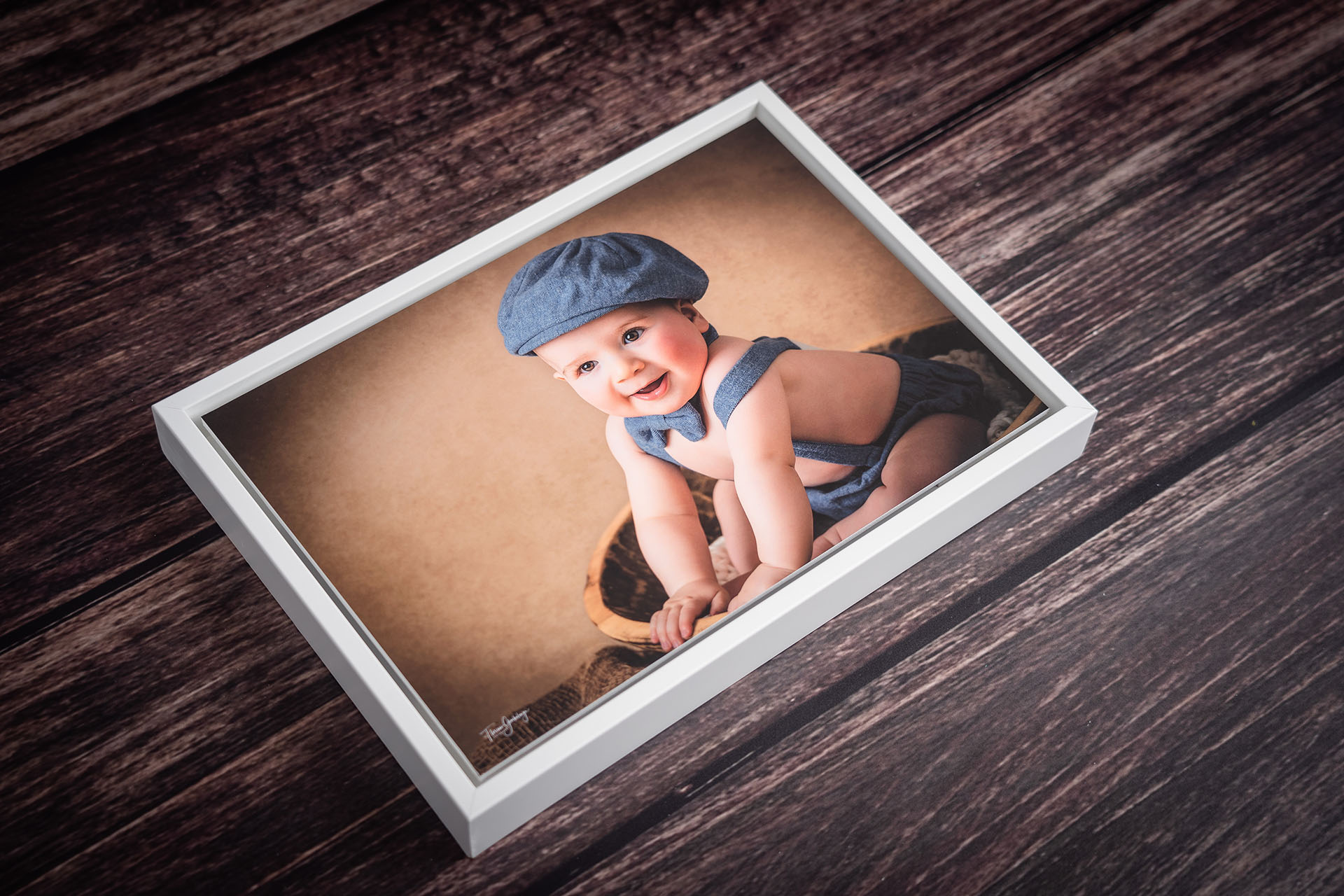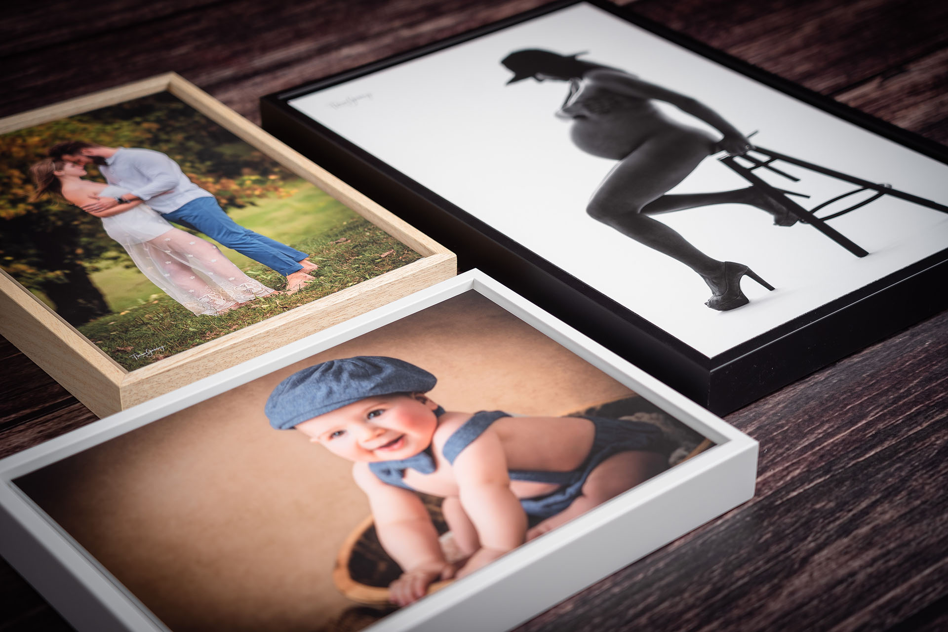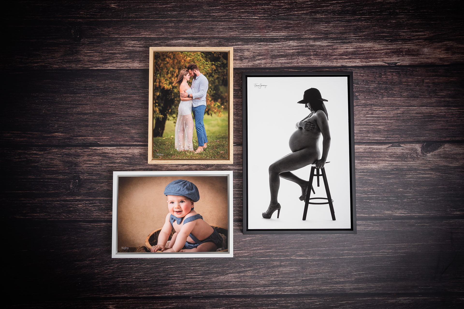 Cornice in legno stile Moderno. Finitura laccata opaca, colore bianco, nero e legno grezzo. La stampa FineArt è applicata ad un pannello da 5 mm e posizionata al centro della cornice senza però entrarne in contatto.